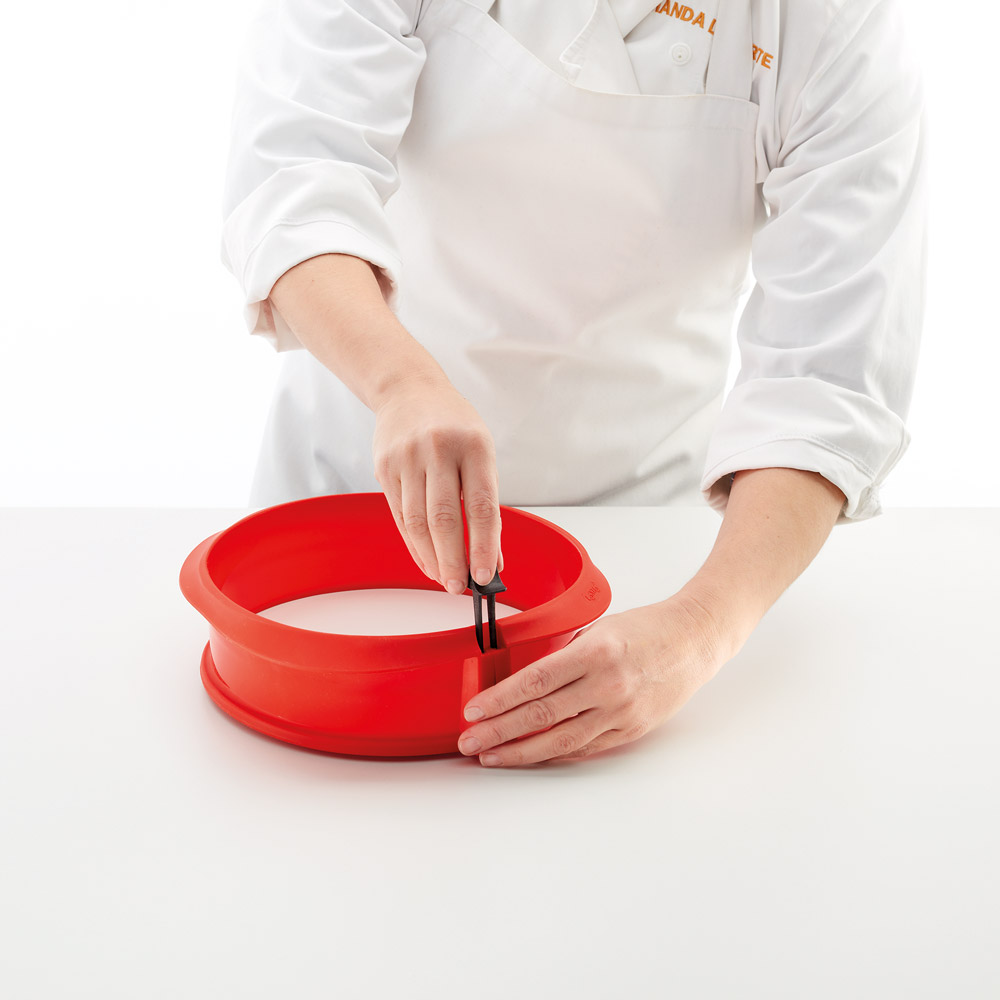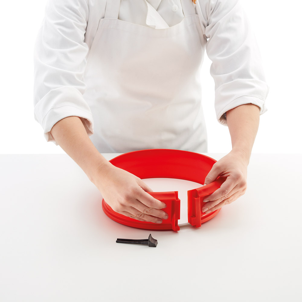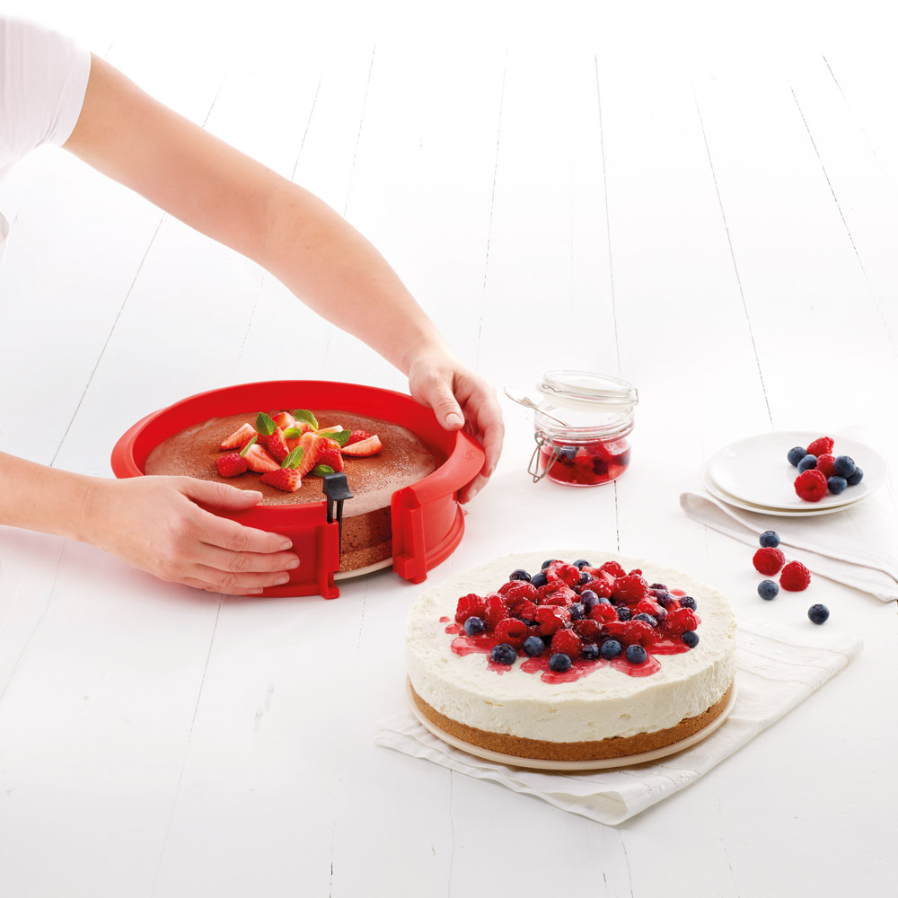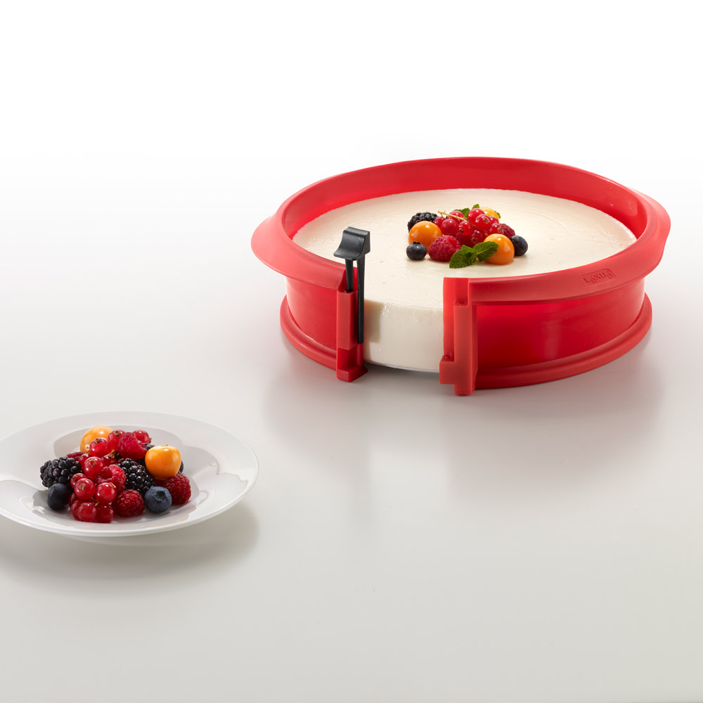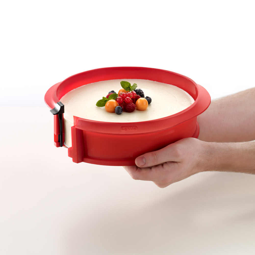 Silikoonist koogivorm koos keraamilise alusega, mida saab kasutada serveerimisalusena