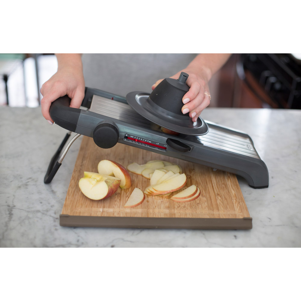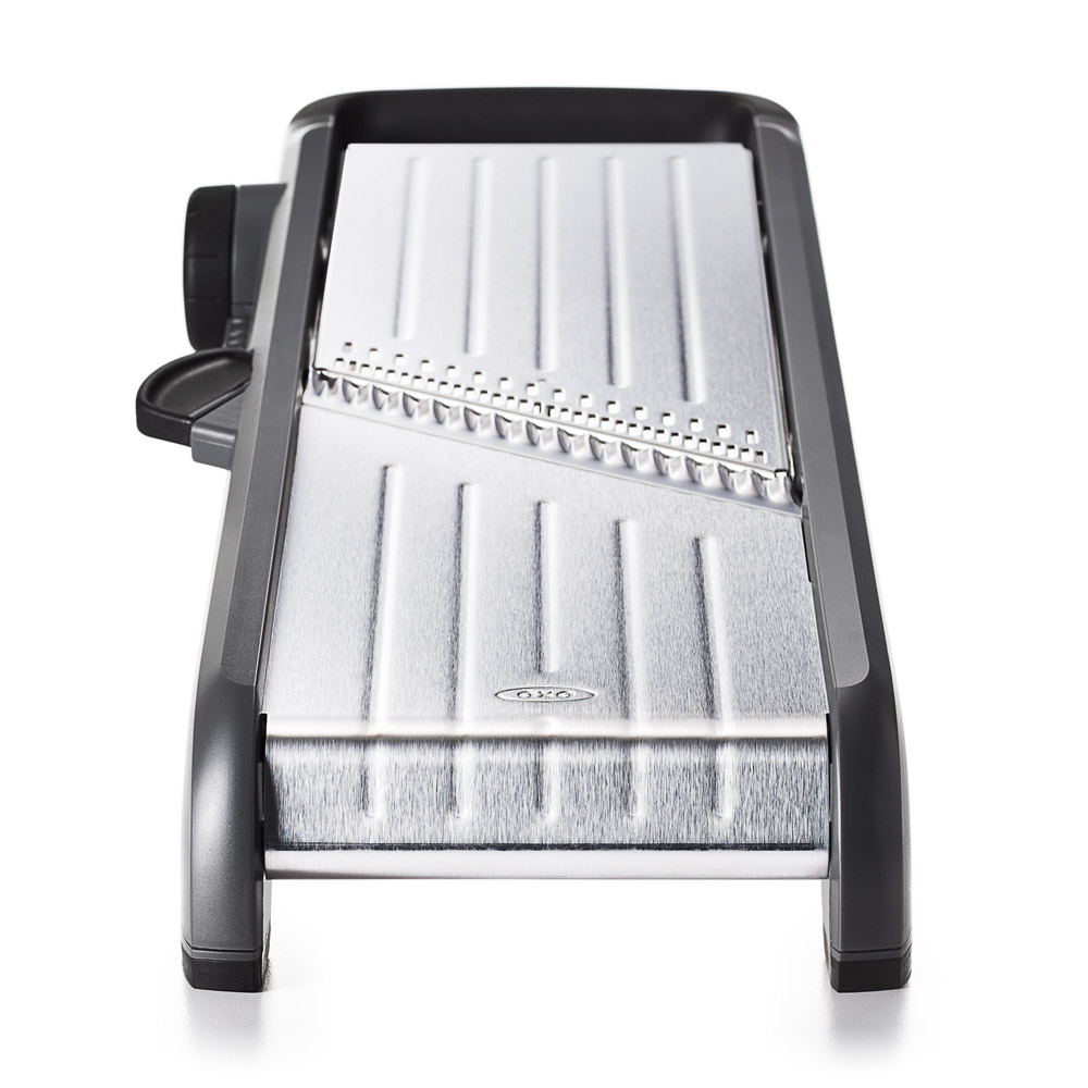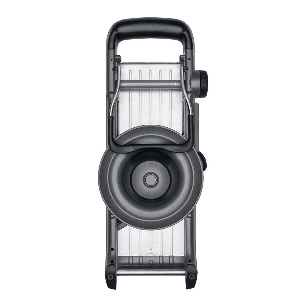 OXO Good Grips mandoliiniga saate luua kuni 21 erinevat viilu ja seadistada lõikepaksuse 0,5mm intervalliga. Komplektis on sirged, lainelised, julienne ja friikartulite lõikamise terad. Mandoliinil on laia äärega ja vedruga toiduhoidik, mis kaitseb sõrmi ning ruumi kokkuhoiuks on seda lihtne hoiustada mandoliini all.