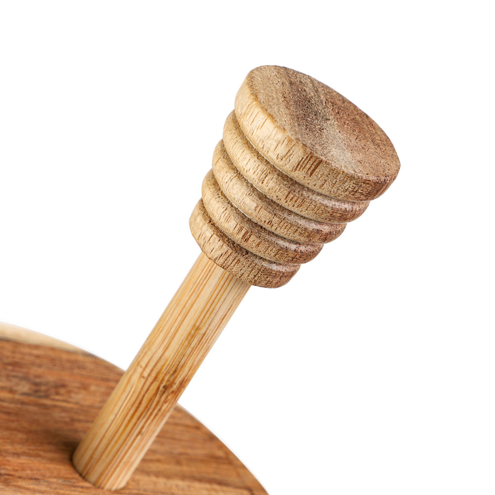 Läbipaistev klaasist nõu koos puidust kaane ja sisseehitatud meevurriga.