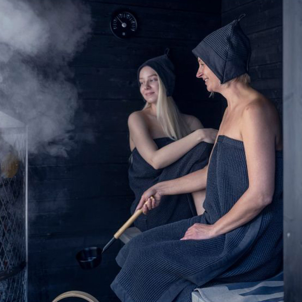 Pehmest puuvillast valmistatud saunamüts kaitseb juukseid ja peanahka saunakuumuse eest ja hoiab pea soojas ka kümblustünnis. Saunamüts sobib nii naistele kui meestele.