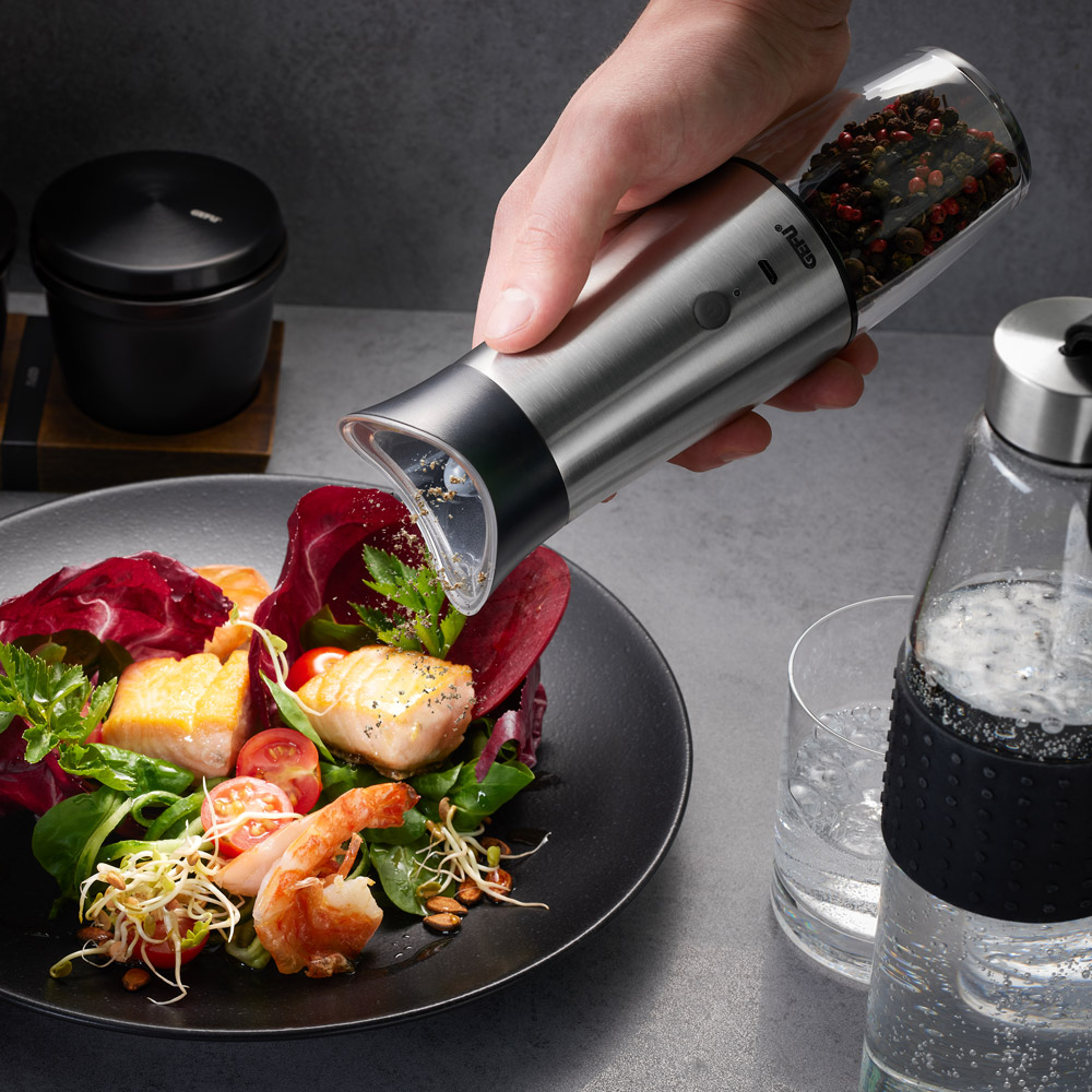 Elektrilisel soola- või pipraveskil VELO on kallutusfunktsiooniga automaatne jahvatus. Sisseehitatud LED-valgustus. USB-laetav. Mahutab kuni 80 g piprateri või 150 g soola.