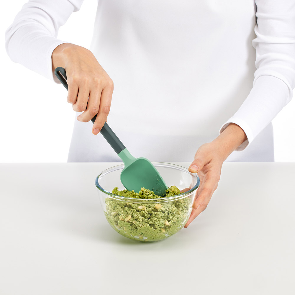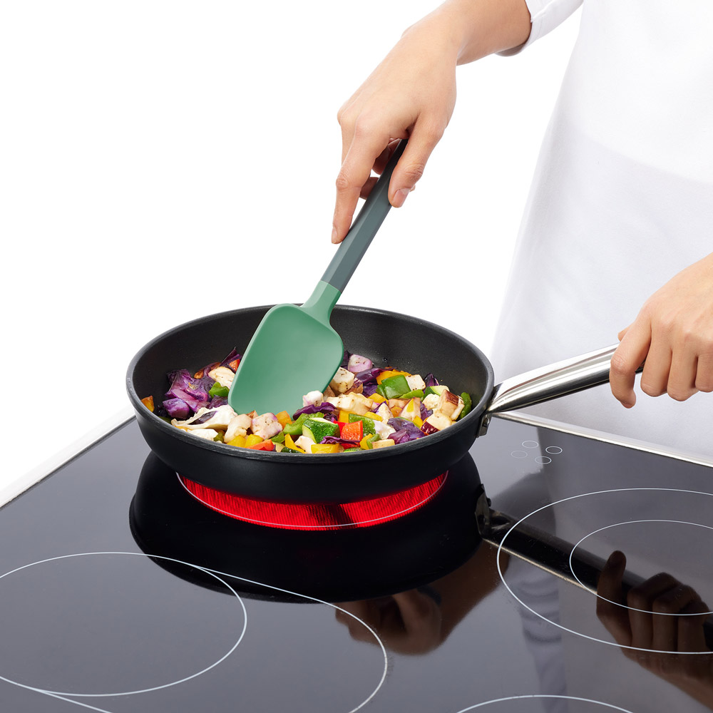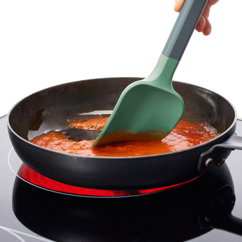 Silikoonist spaatel-lusikas, mis sobib pannil toidu valmistamiseks või taina segamiseks.